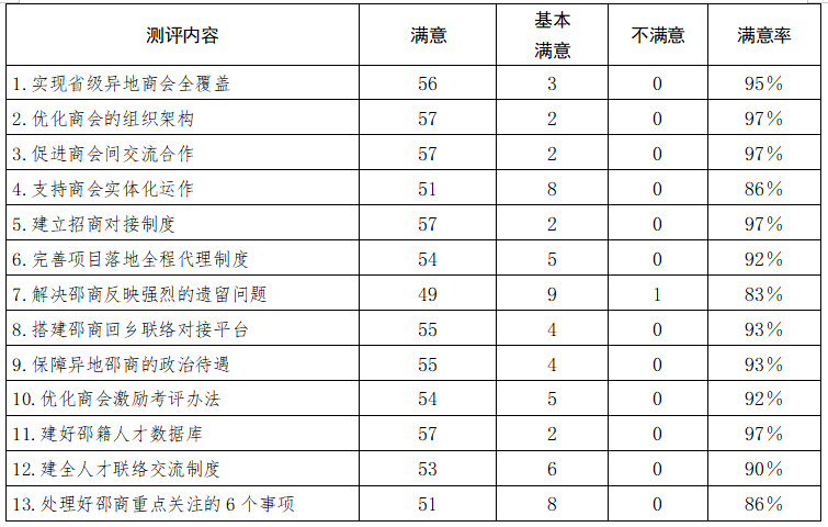 2025年10月25日,政协邵阳市第十三届委员会常务委员会第二十次会议对2024年度《关于“激发商会潜能 助推招商引资提质增效”向中共邵阳市委、邵阳市人民政府的建议案》落实情况进行了民主测评。本次常委会会议实到常委会组成人员59人(超过全体组成人员的三分之二),测评表发出59张,收回59张,测评结果有效。测评内容主要包含《建议案》提出的建立健全商会发展机制、联络对接机制、商会激励机制、人才使用机制等四个方面的12条具体建议和6个邵商重点关注事项的落实情况。现将测评结果予以公告。